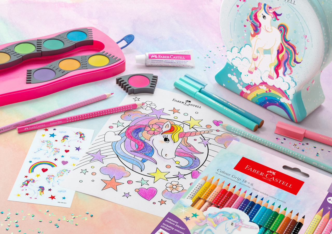 Kredki Colour Grip 2001 Faber-Castell Edycja Unicorn 18 szt. + kredki Sparkle pastelowe 6 szt. + naklejki w opakowaniu kartonowym z motywem jednorożców. Doskonałe do wielu technik artystycznych, dla hobbystów i starszych dzieci. Zachwycają żywymi i intensywnymi kolorami. Posiadają wysokiej jakości rozpuszczalny w wodzie pigment, umożliwiający osiągnięcie efektu jak przy wykorzystaniu tradycyjnych akwareli. To gwarancja fantastycznych rezultatów i doskonałej zabawy. Wystarczy kilka ruchów wilgotnym pędzlem po narysowanym wzorze, by wydobyć wyjątkowy efekt obrazu akwarelowego. Wyjątkowo gładkie i miękkie w aplikacji. Ergonomiczny trójkątny kształt i charakterystyczna dla tej serii opatentowana strefa Grip z małymi, antypoślizgowymi punktami zapewniają wysoki komfort użytkowania i niemęczące, wygodne rysowanie. Odpowiednie również dla leworęcznych. Kolory spieralne z większości tkanin. Grafity są wysoko odporne na pękanie, dzięki bezpiecznemu procesowi wiązania (SV). Wykonane z certyfikowanego drewna pochodzącego ze zrównoważonego i odpowiedzialnie zarządzanego leśnictwa. Powierzchnie pokryte lakierem na bazie wody – bezpiecznym dla środowiska i zdrowia dzieci. Emisja CO2 spowodowana procesem produkcyjnym tych produktów jest neutralizowana przez certyfikowane projekty.
