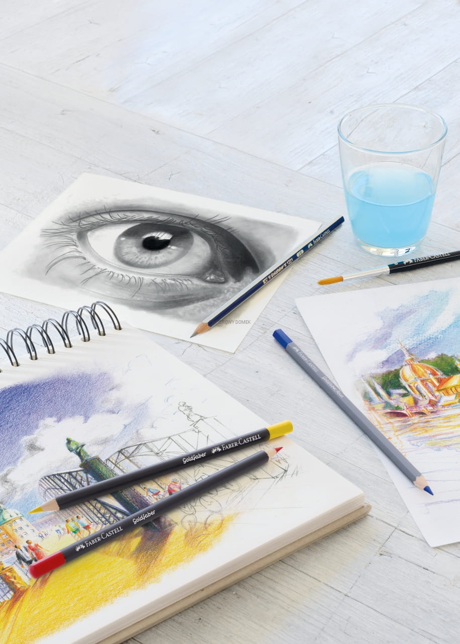Kredki Goldfaber Aqua charakteryzują się wyjątkowo miękkim nakładaniem kolorów i zachwycają intensywnością kolorów niezależnie czy są używana na sucho czy na mokro. Wszystkie techniki rysowania na sucho mogą być stosowane przy użyciu tych kredek akwarelowych. Przy użyciu mokrego pędzla szkic lub motyw zaprojektowany przy użyciu kredek Goldfaber Aqua można zamienić w wspaniałą akwarelę. W pełni rozpuszczalny grafit został wyprodukowany z wykorzystaniem najbardziej innowacyjnych technologii i zachwyca doskonałą odpornością na światło. Kredki pozwalają na dużo bardziej precyzyjną pracę niż przy użyciu tradycyjnych farb akwarelowych, które łatwo wysychają i mogą pozostawiać niechciane plamy. Sprawdzają się świetnie również na kolorowym i ciemnym papierze – doskonała pigmentacja pozwala na przeniesienie wszystkich kreatywnych pomysłów do życia!