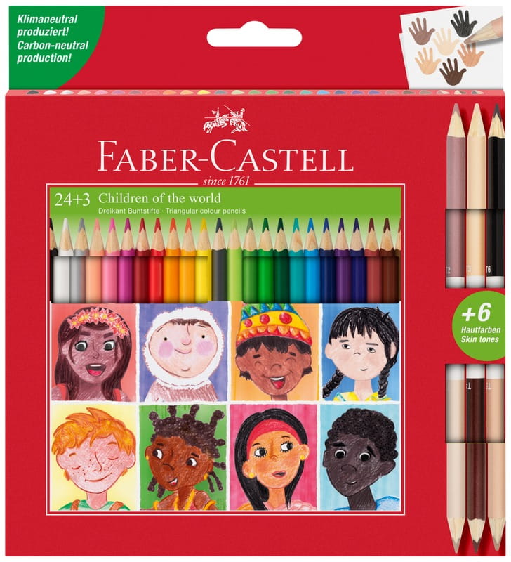 Kredki ołówkowe Faber-Castell 24 szt. w edycji specjalnej z kredkami dwustronnymi Children of the World 3 szt. (6 kolorów) w odcieniach skóry w opakowaniu kartonowym. Klasyczne i doskonałe w swojej prostocie. To wysokiej jakości produkt, w dobrej cenie. Wyraźne i nasycone kolory, specjalnie dobrane przez nauczycieli, optymalnie miękkie i gładkie w aplikacji. Spieralne z większości tkanin. Ergonomiczny trójkątny kształt dla wysokiego komfortu użytkowania i możliwości wygodnej, niestrudzonej artystycznej ekspresji. Grafit kredek jest wysoko odporny na pękanie, dzięki bezpiecznemu procesowi wiązania (SV). Wykonane z certyfikowanego drewna pochodzącego ze zrównoważonego i odpowiedzialnie zarządzanego leśnictwa. Emisja CO2 spowodowana procesem produkcyjnym tych produktów jest neutralizowana przez certyfikowane projekty.