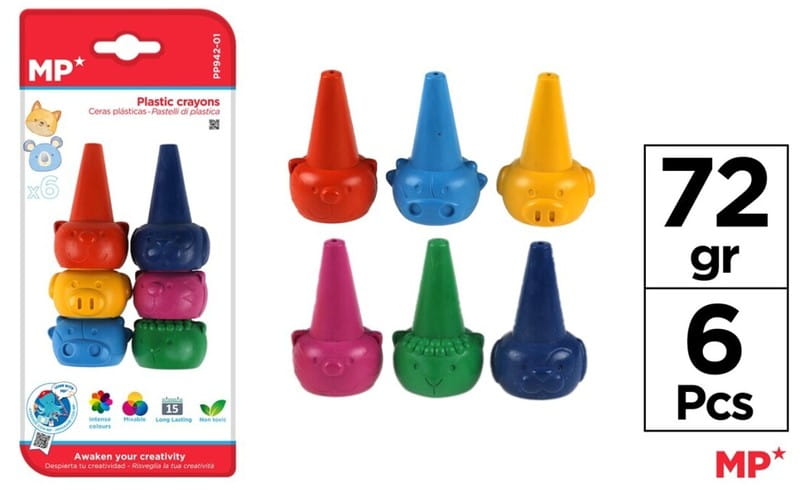 Kredki świecowe bardzo czyste i wytrzymałe, o bardzo zabawnych kształtach. Świetna zdolność krycia i wysoka odporność na wstrząsy. Idealne, aby zachęcić dzieci do kreatywności ze względu na ich różne kształty, kolory i ponieważ są nietoksyczne.