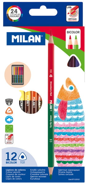 Kredki ołówkowe cienkie, dwustronne 12 sztuk = 24 kolory. Średnica grafitu 2,9 mm. Ergonomiczny trójkątny kształt. Posiadają unikalny system Lead Protection System (LPS), który zwiększa odporność grafitu na złamania poprzez przyklejenie go do drewna. Drewno jest wytrzymałe i miękkie umożliwiając łatwe temperowanie. Wysokiej jakości pigmenty w żywych, intensywnych kolorach są odporne na działanie światła. Kreska wykonana kredką MILAN jest miękka, jednolita o wyraźnym odcieniu. Nie tworzy rowków ani nie niszczy papieru. Drewno pochodzi ze zrównoważonych plantacji. Każda kredka ma nadrukowaną nazwę koloru po angielsku. Kredki MILAN są zgodne z europejskimi i amerykańskimi normami bezpieczeństwa. Nie zawierają ftalanów, metali ciężkich i innych substancji toksycznych. Są bezpieczne dla dzieci. Rozmiar kredki: 17,5 x 0,64 cm. Rozmiar opakowania: 21,8 x 10 x 1 cm.