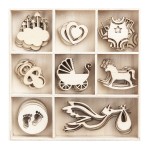Fantastyczny zestaw kształtów z drewna a'la chipboard to idealny zestaw dla projektów na "baby shower". W drewnianej skrzyneczce znajduje się 40 aplikacji, w tym 8 różnych wzorów. Niektóre wzory posiadają dziurkę, przez którą można przewlec np. lniane nici dpCraft i utworzyć urocze zawieszki.