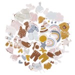 Brokatowe kształty papierowe Baby łączą stonowane, pastelowe kolory z dziecięcymi motywami w stylu vintage. Znajdziesz wśród nich m.in. wzory ubranek, zabawek, serduszek, chmurek oraz tęczy. W ofercie dostępne są również naklejki z brokatem Baby boy oraz Baby girl, które idealnie pasują do elementów z tego zestawu.