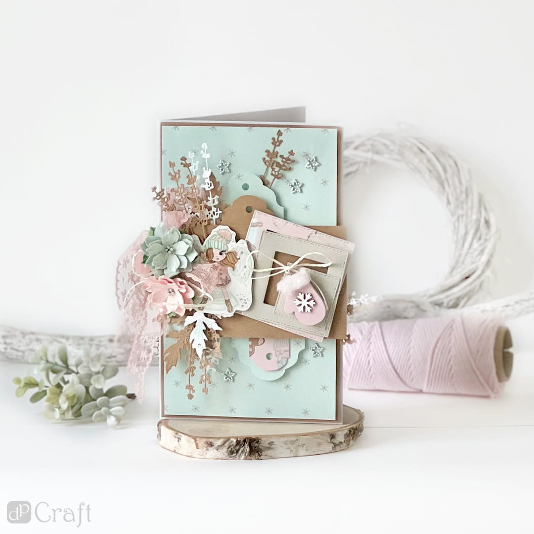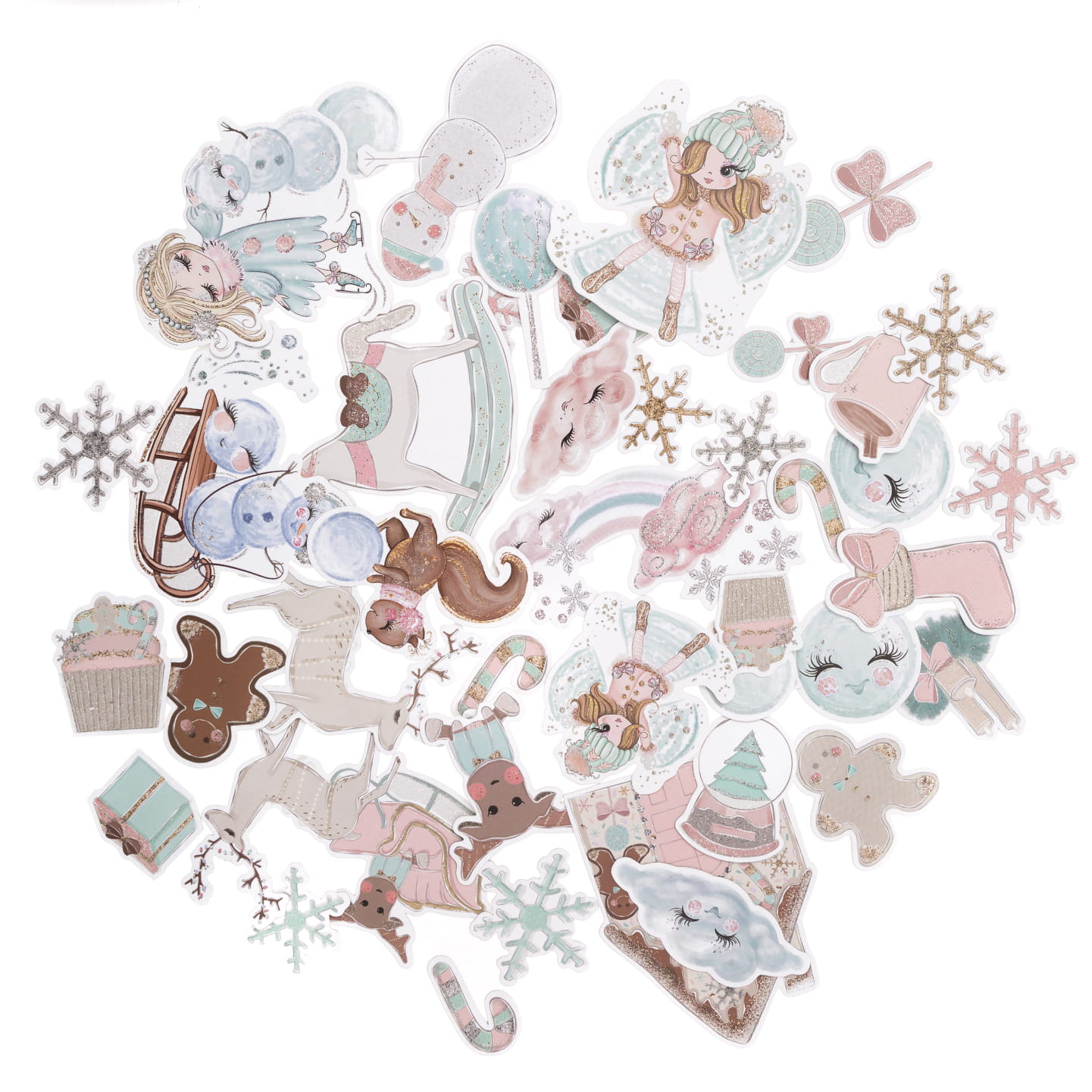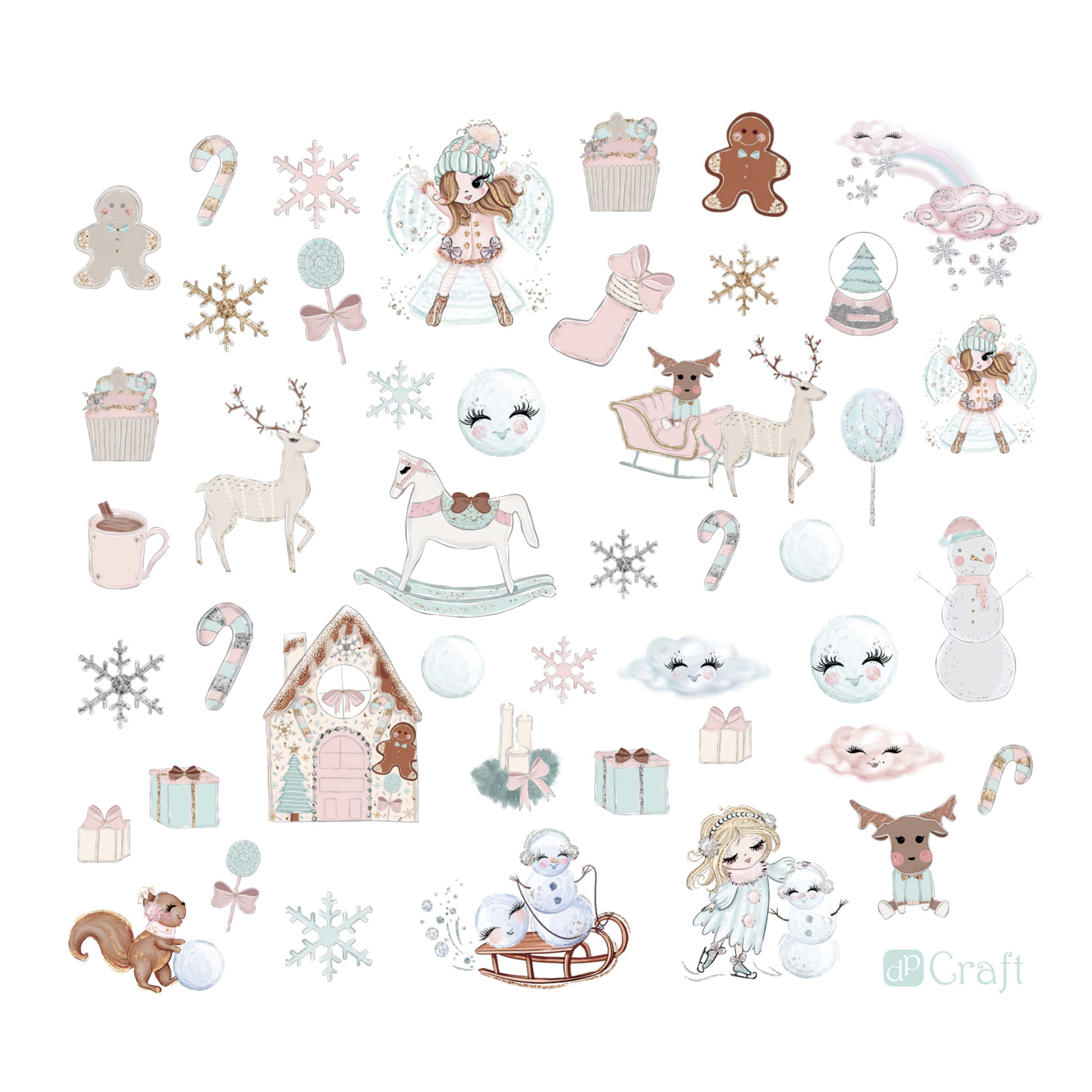 Frosty Pastels to kolekcja, która łączy delikatną, pastelową kolorystykę z zimowymi motywami. Znajdziesz tu sanie, bałwanki, renifery, uroczego konika na biegunach, chatkę z piernika, postać uroczej dziewczynki i wiele innych motywów. W kolekcji Frosty Pastels znajdziesz również naklejki z brokatem, tasiemki, pompony i kwiaty z papieru - wszystko w dopasowanej estetyce.