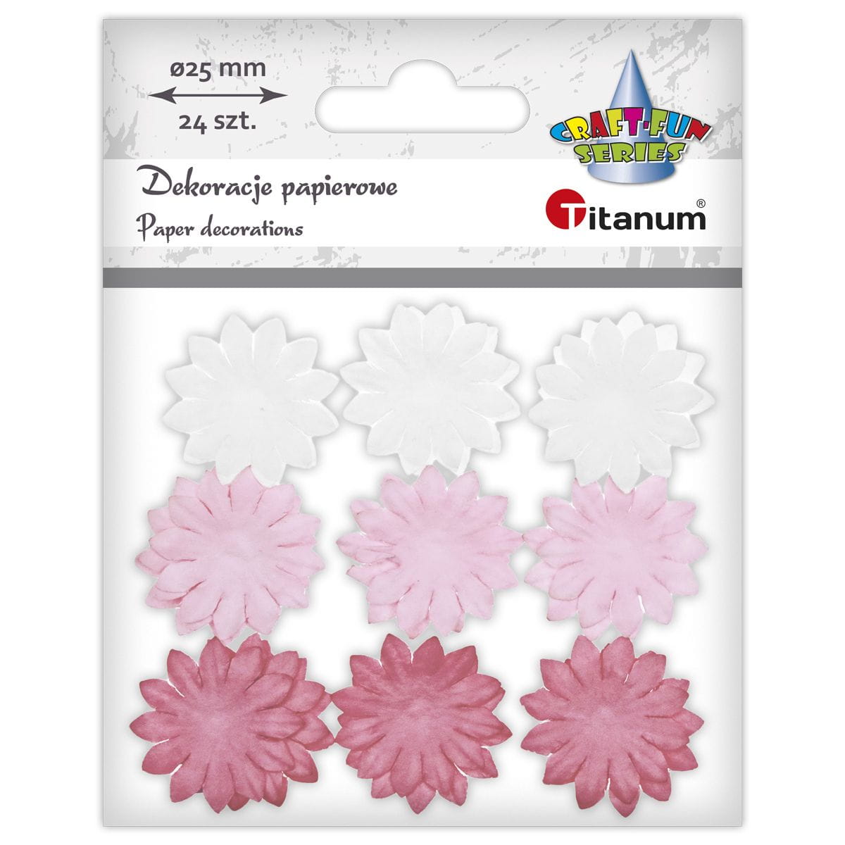 Kwiaty papierowe, średnica 25 mm, kolor: białe, jasnoróżowe, różowe. 24 sztuki.