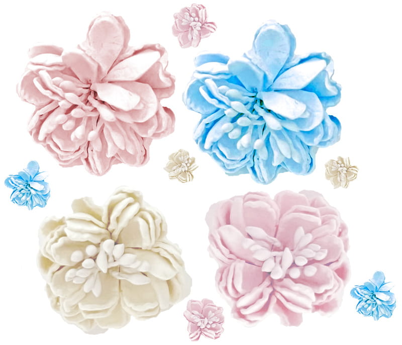 W opakowaniu znajdziesz ręcznie robione kamelie o dwóch wielkościach i w trzech kolorach: kremowym, jasnoróżowym oraz błękitnym.