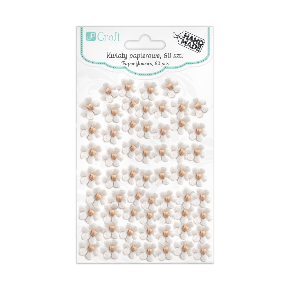Ręcznie modelowane, przestrzenne kwiaty papierowe. Główki kwiatów wyglądają realistycznie i mogą stanowić samodzielną, wyjątkową dekorację. Polecamy do zdobienia w projektach ślubnych i komunijnych. Doskonale sprawdzą się w scrapbookingu, cardmakingu, projektach home decor, do pakowania prezentów, a także do wszelkiego rodzaju aktywności twórczej. Ilość w opakowaniu: 60 szt. Wielkość kwiatka (około): 10 mm Kolor: białe