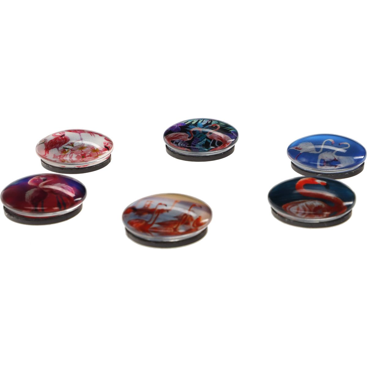 Wysokiej jakości kolorowe magnesy szklane wypukłe z motywem flamingów. Zawdzięczają swój oryginalny wygląd szlachetnemu surowcowi jakim jest szkło. Dostępne w różnych wzorach oraz kolorach rozweselą i zachwycą zarówno najmłodszych jak i dorosłych. Idealne do tablic magnetycznych lub na lodówkę, do zawieszenia notatek, zdjęć z wakacji czy listy zadań i zakupów, o których nie możemy zapomnieć, karteczka z informacjami przyczepiona oryginalnym magnesem na pewno wpadnie nam w oko. To świetny sposób na przypinanie ważnych informacji w widocznym miejscu. Bez robienia dziur w ścianach, czy przyklejania taśmą klejącą, szybko, sprawnie i wygodnie. Średnica: 30 mm. Pakowane na blistrze po 6 sztuk.
