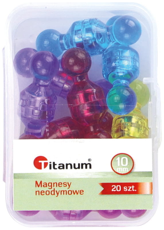 Komplet silnie przyciągających magnesów neodymowych o wyprofilowanym kształcie, który ułatwia chwytanie oraz zapewnia wygodne użytkowanie. Plastikowa, transparentna obudowa w kształcie pionka. Bardzo mocne, mimo niewielkich rozmiarów wytwarzają silne pole magnetyczne, dzięki czemu wykazują dużą wytrzymałość. Utrzymują do 10 kartek A4. Idealne do tablic magnetycznych, na lodówkę, do biura i szkoły, agencji reklamowych. Dzięki zwiększonej sile przyciągania, magnesy neodymowe idealnie nadają się również do tablic szklanych. Średnica magnesu 10 mm. Mix kolorów. Pakowane w plastikowe przezroczyste, praktyczne pudełko po 20 szt.