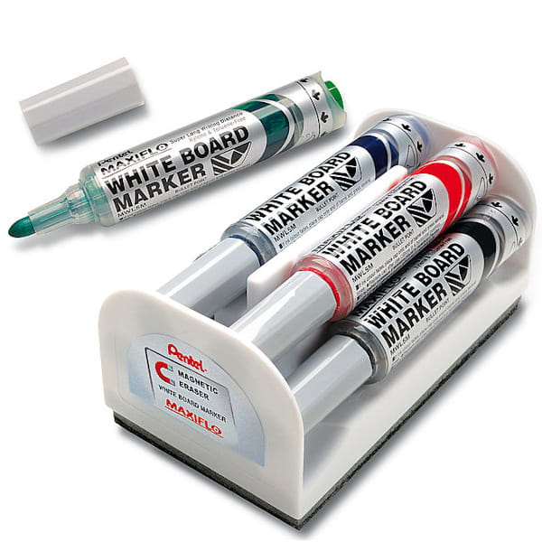 Markery suchościeralne do tablic Maxiflo 4 kolory + gąbka, Pentel