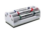 Zestaw czterech markerów do białych tablic z okrąglą końcówką. Zestaw z magnetyczną gąbką. Długość linii pisania 1200m, grubość linii pisania 1,1-2,2mm. Markery w kolorach: czarnym, czerwonym, niebieskim, zielonym.