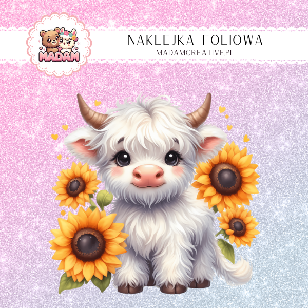 Naklejka Foliowa Biała Krówka z Słonecznikami – Tęczowa Elegancja na Łące! Madam