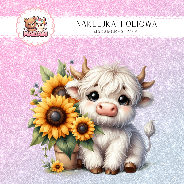 Naklejka Foliowa Krówka z Słonecznikowym Bukietem – Błyszczące Cudo Natury! Madam