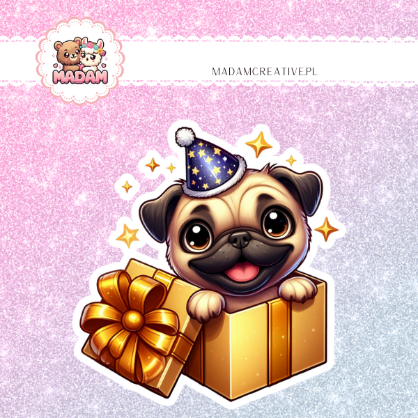 Naklejka Foliowa Mops z Prezentem – Uśmiech na Urodziny! Madam