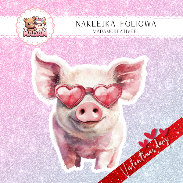 Naklejka Foliowa Pojedyncza Walentynkowa Świnka w Okularach w Kształcie Serduszek – Różowe okulary, różowe serce! Madam
