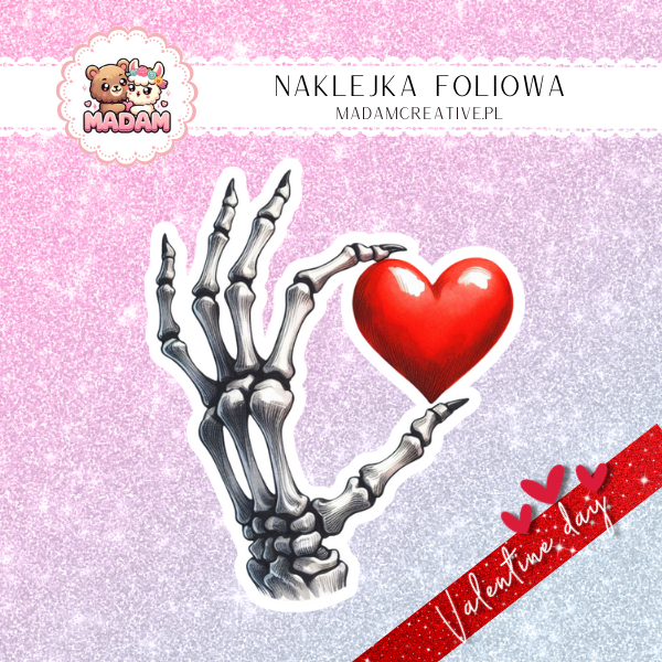 Naklejka Foliowa Pojedyncza Walentynkowa Szkieletowa Dłoń z Sercem – Nawet kości nie kryją miłości! Madam