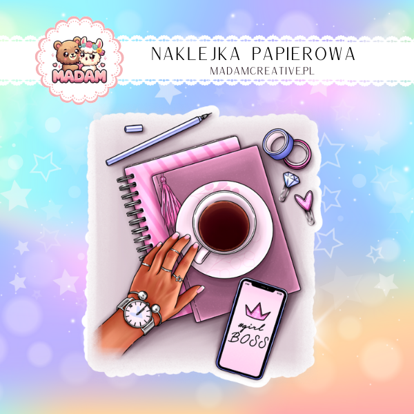 Naklejka Papierowa Pojedyncza Girl Boss przy Kawie – Organizacja i styl w różowym wydaniu! Madam