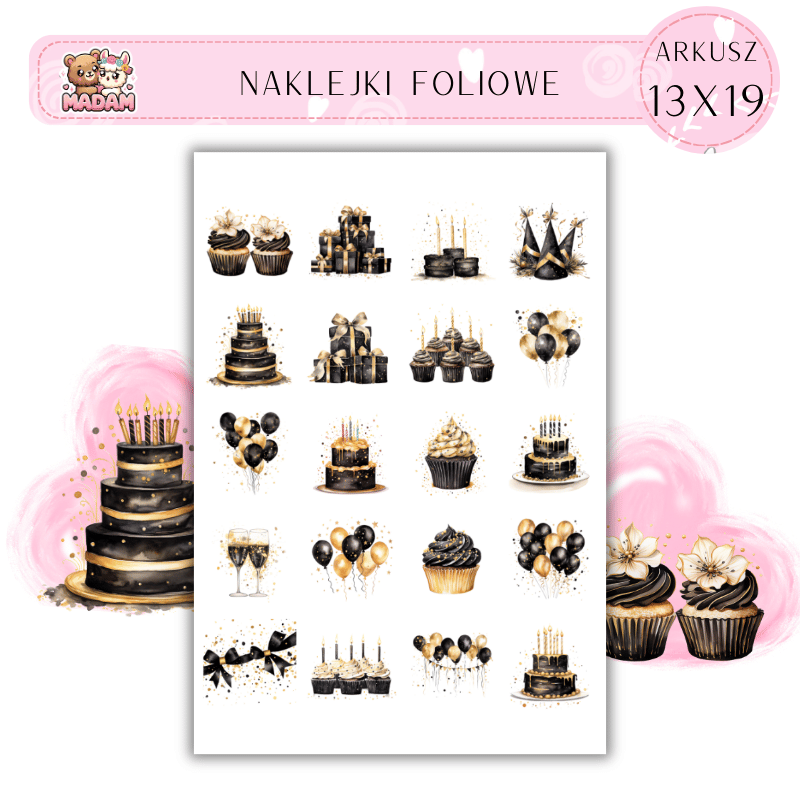 Naklejki Foliowe Czarno Złota Impreza Urodziny 13x19, Madam