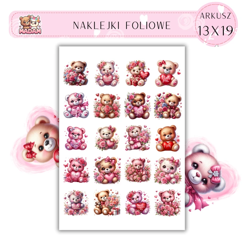 Naklejki Foliowe Misie Serca Love 13x19, Madam