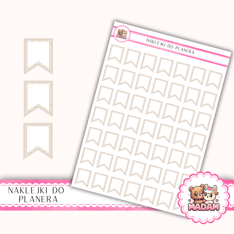 Arkusze w formacie 13x18 cm zawierają flagi w równych rzędach, zaprojektowane z dbałością o proporcje i estetykę. Naklejki dostępne są w wariantach kolorystycznych – pastelowych, neutralnych, klasycznych i sezonowych. Papierowy, samoprzylepny materiał sprawia, że flagi są łatwe do naklejania i idealnie przylegają do stron planera.