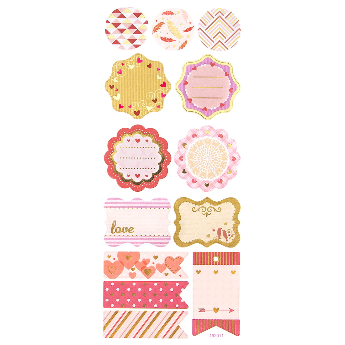Kolorowe papierowe naklejki zdobione złotą folią z motywami tagów. Polecamy do zdobienia prac scrapbookingowych, kartek czy opakowań prezentów. Naklejki dpCraft są też zawsze mile widziane we wszelkiego rodzaju dziecięcej aktywności twórczej. Format arkusza: 10 x 23 cm