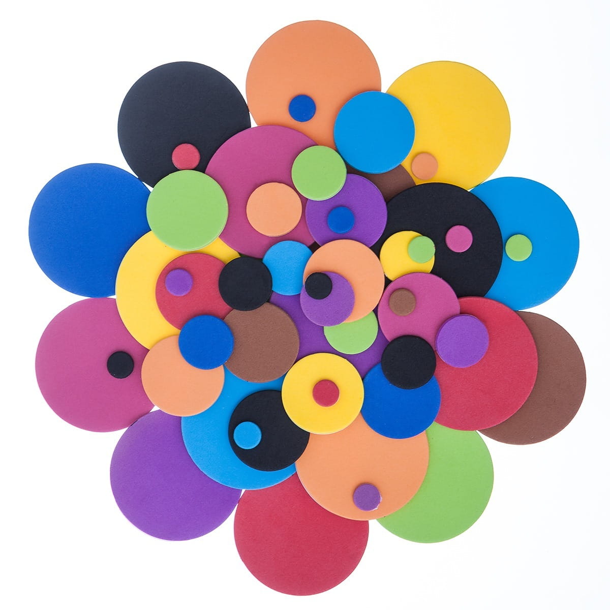 Zestaw naklejek z pianki w kształcie kół, w kilku rozmiarach i kolorach. Świetnie nadają się do wszelkiego rodzaju dziecięcej aktywności twórczej, jak również do zdobienia projektów kreatywnych takich jak kartki okolicznościowe, albumy, pudełka, opakowania prezentów i wielu innych. Ilość w opakowaniu: 100 szt. Rozmiar: 1 cm, 2 cm, 3 cm, 5 cm Kolor: mix 10 kolorów
