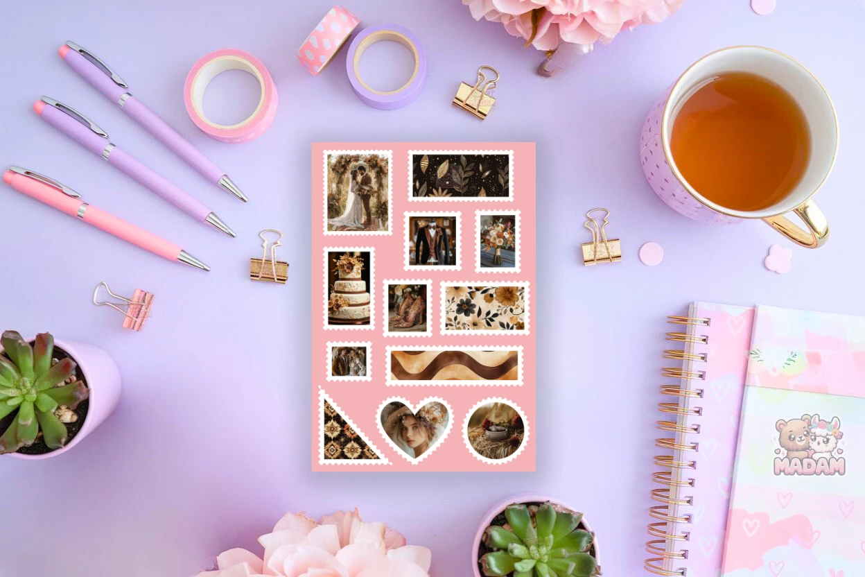 Naklejki znaczki pocztowe boho ślub w stylu western od MaDam Creative – arkusz 13 × 19 cm idealny do bullet journali, plannerów, scrapbookingu i kreatywnych dekoracji.
