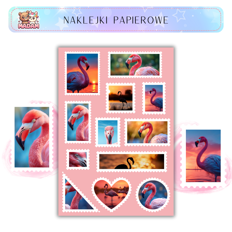 Naklejki znaczki pocztowe flamingi od MaDam Creative – arkusz 13 × 19 cm idealny do bullet journali, plannerów, scrapbookingu i kreatywnych dekoracji.