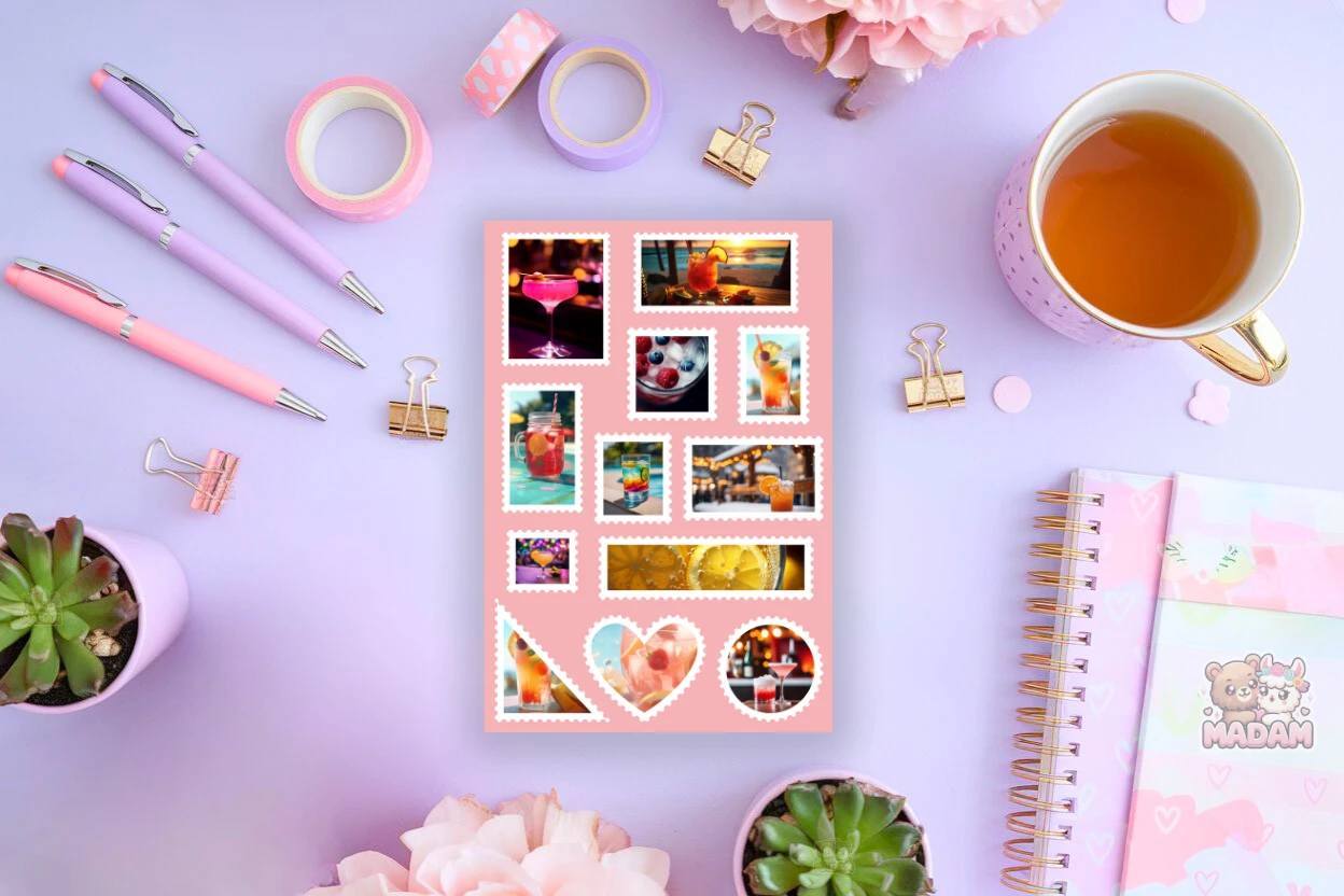 Naklejki znaczki pocztowe kolorowe drinki od MaDam Creative – arkusz 13 × 19 cm idealny do bullet journali, plannerów, scrapbookingu i kreatywnych dekoracji.