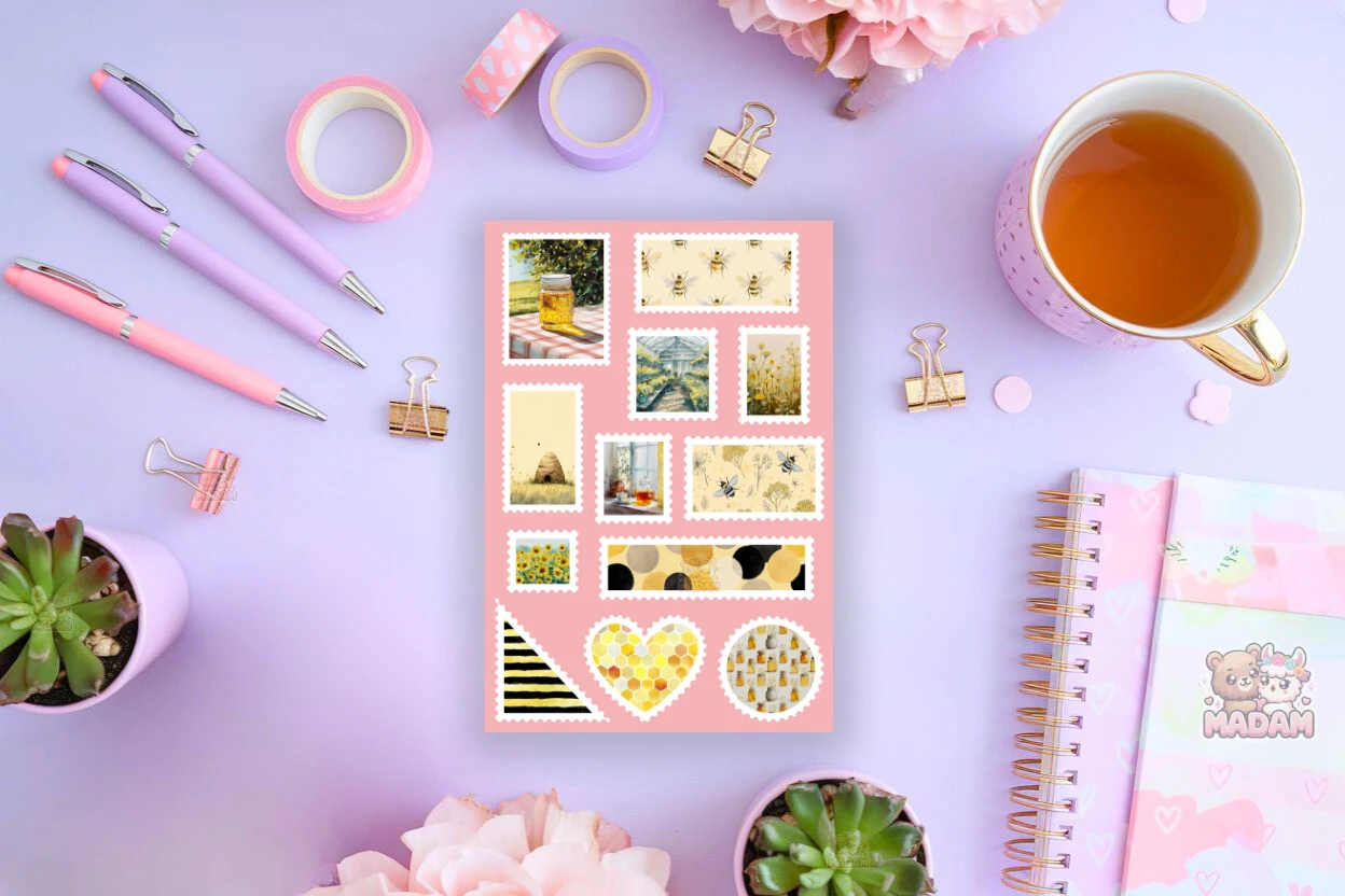 Naklejki znaczki pocztowe Letni ogród pełen miodu od MaDam Creative – arkusz 13 × 19 cm idealny do bullet journali, plannerów, scrapbookingu i kreatywnych dekoracji.