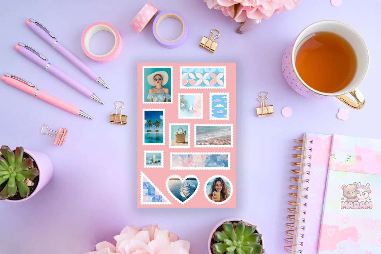 Naklejki znaczki pocztowe letnia przygoda rejsowa marki MaDam Creative to arkusz 13 × 19 cm pełen unikalnych ilustracji. Sprawdzą się w bullet journali, plannerach, scrapbookingu, kartkach i albumach. Wykonane z wysokiej jakości papieru matowego, posiadają mocny klej, który osiąga pełną przyczepność po 24 h.
