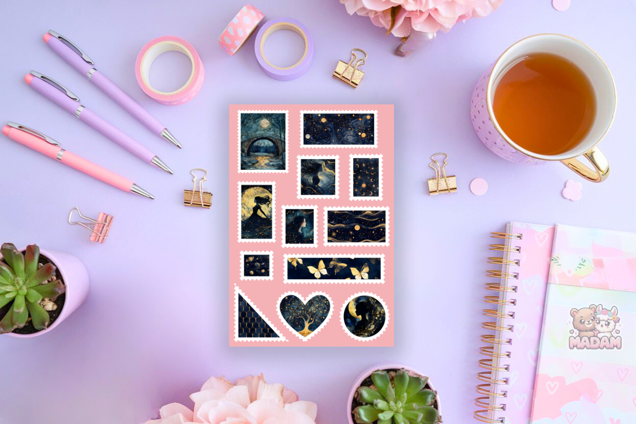 Naklejki znaczki pocztowe magiczny kosmos od MaDam Creative – arkusz 13 × 19 cm idealny do bullet journali, plannerów, scrapbookingu i kreatywnych dekoracji.