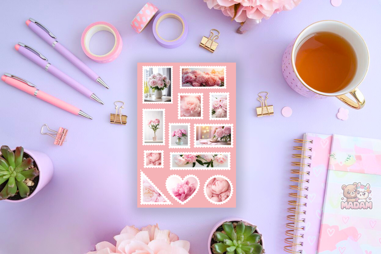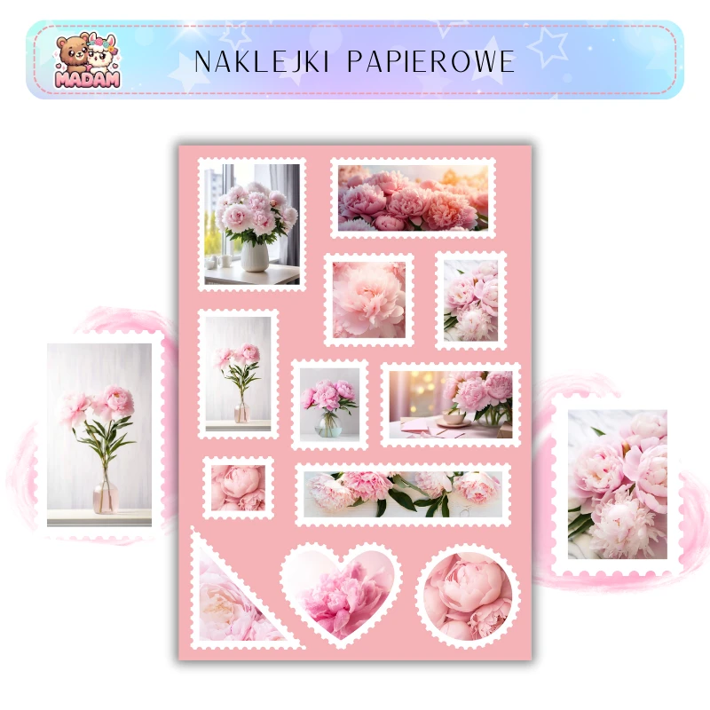 Naklejki znaczki pocztowe Piwonie od MaDam Creative – arkusz 13 × 19 cm idealny do bullet journali, plannerów, scrapbookingu i kreatywnych dekoracji.
