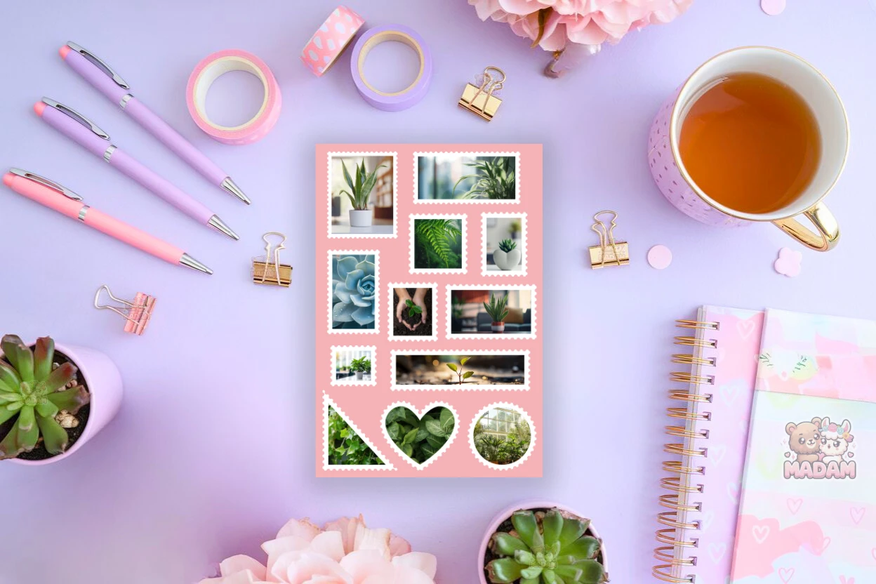 Naklejki znaczki pocztowe Rośliny Doniczkowe Plants od MaDam Creative – arkusz 13 × 19 cm idealny do bullet journali, plannerów, scrapbookingu i kreatywnych dekoracji.