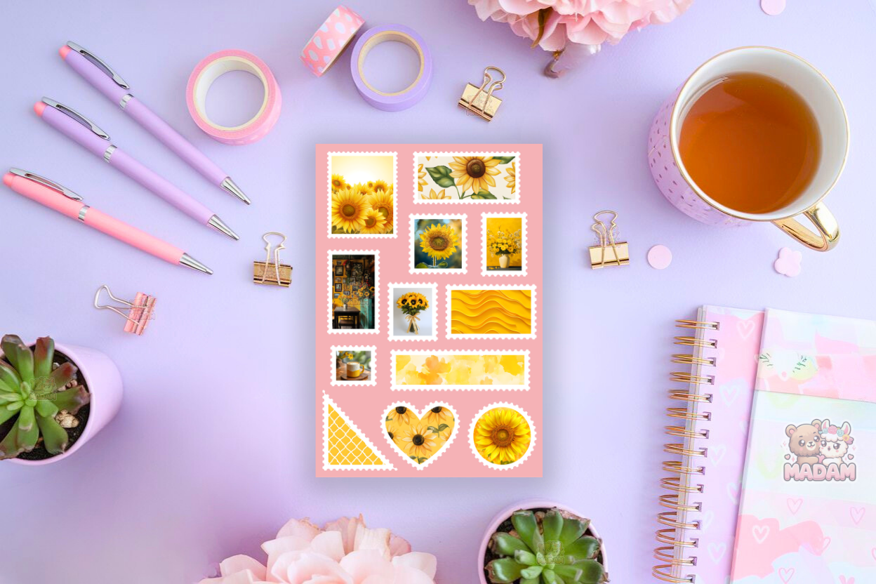Naklejki znaczki pocztowe słoneczniki od MaDam Creative – arkusz 13 × 19 cm idealny do bullet journali, plannerów, scrapbookingu i kreatywnych dekoracji.