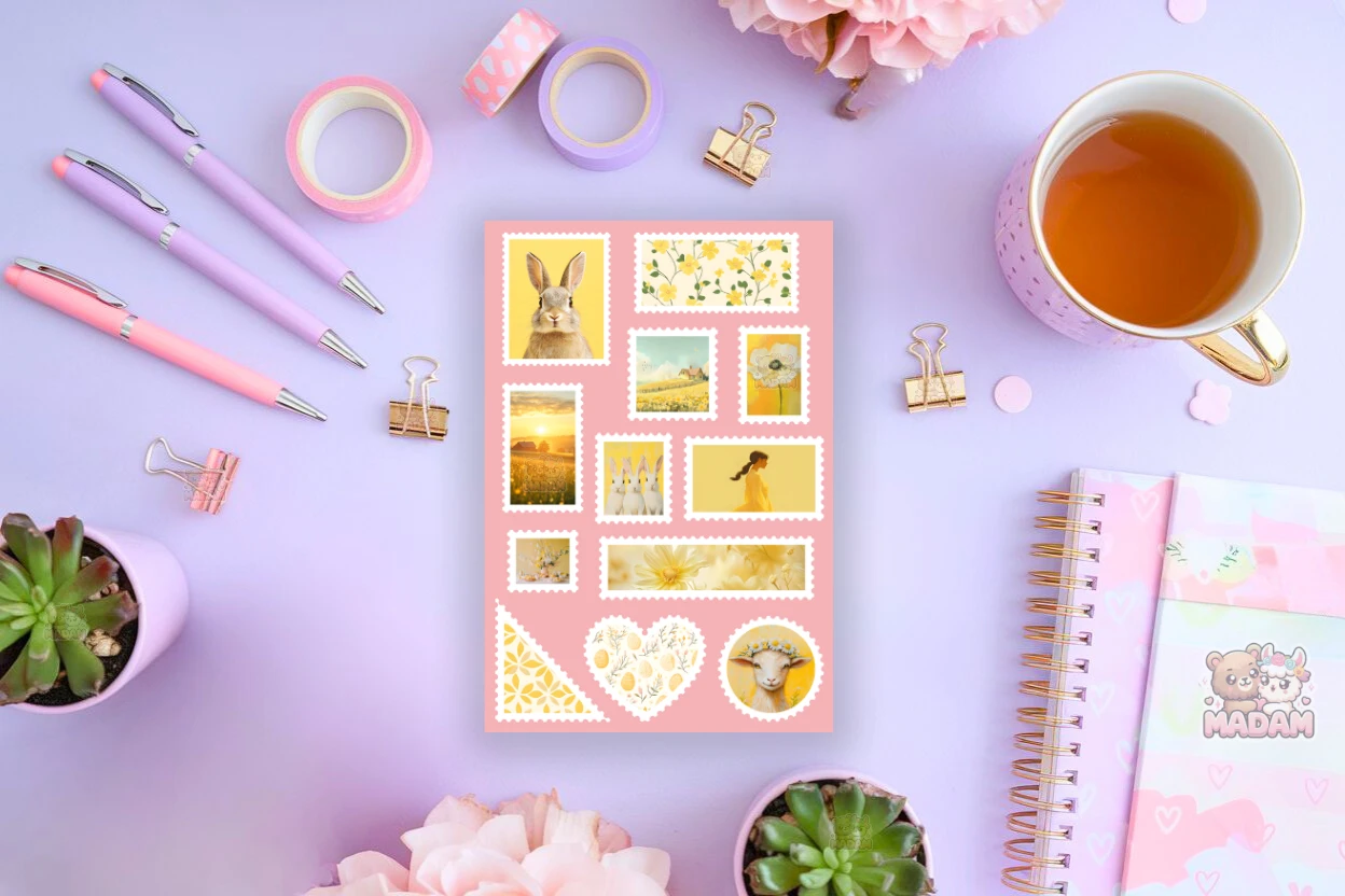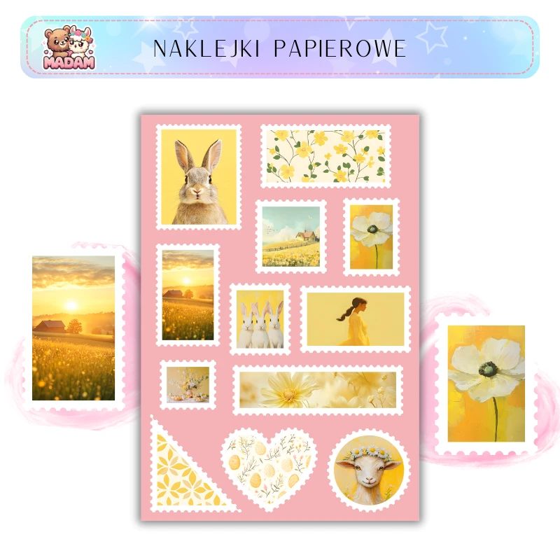 Naklejki znaczki pocztowe Wielkanoc w stylu rustykalnym od MaDam Creative – arkusz 13 × 19 cm idealny do bullet journali, plannerów, scrapbookingu i kreatywnych dekoracji.