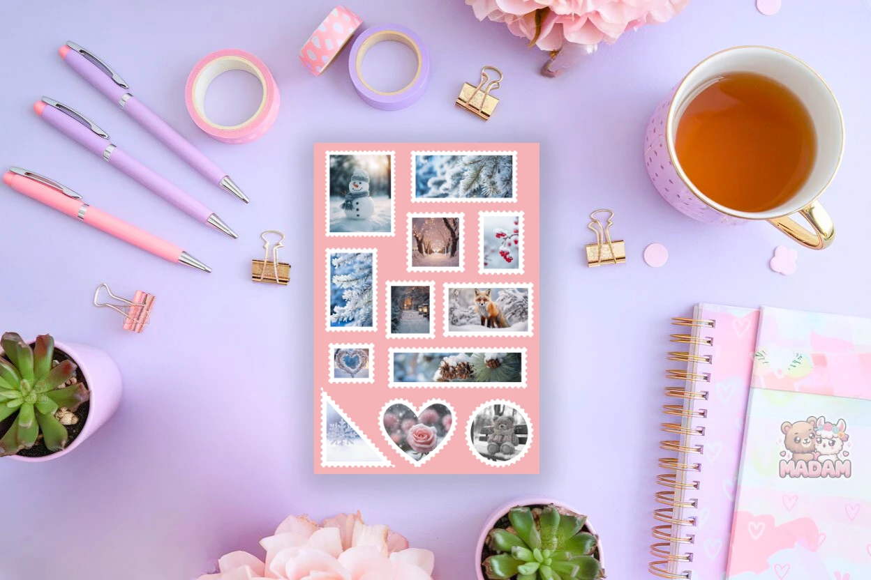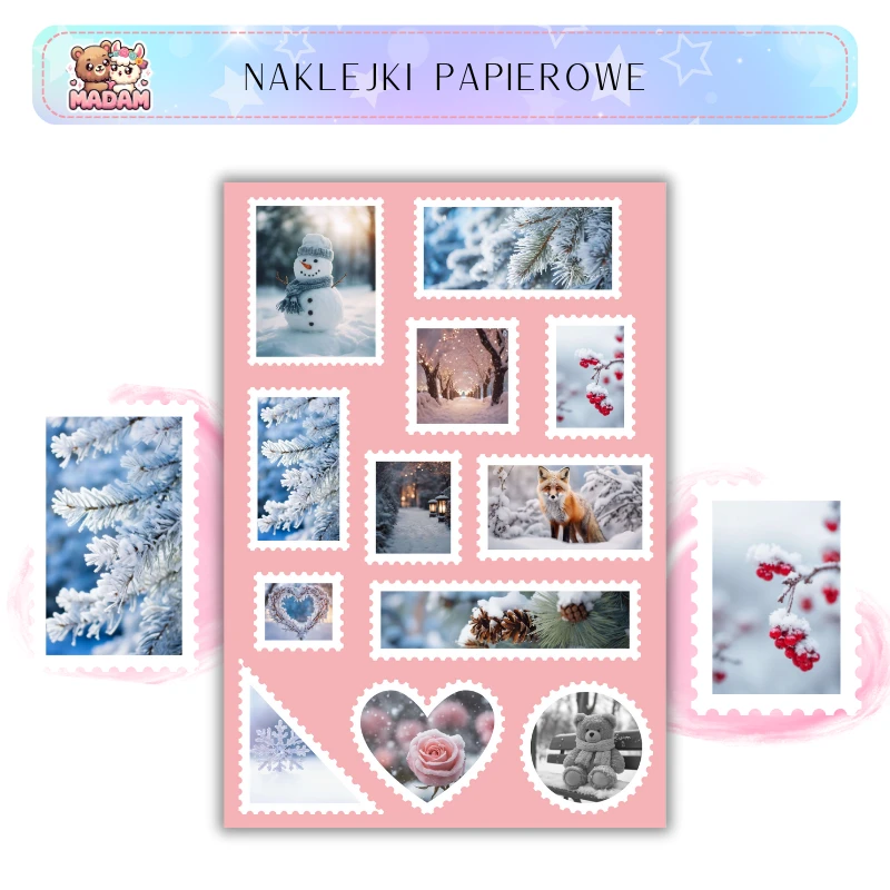 Naklejki Znaczki Pocztowe Zima od MaDam Creative – arkusz 13 × 19 cm idealny do bullet journali, plannerów, scrapbookingu i kreatywnych dekoracji.