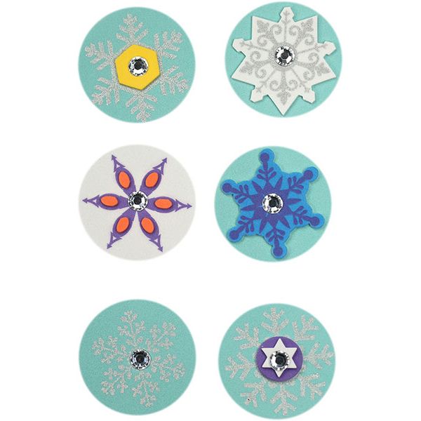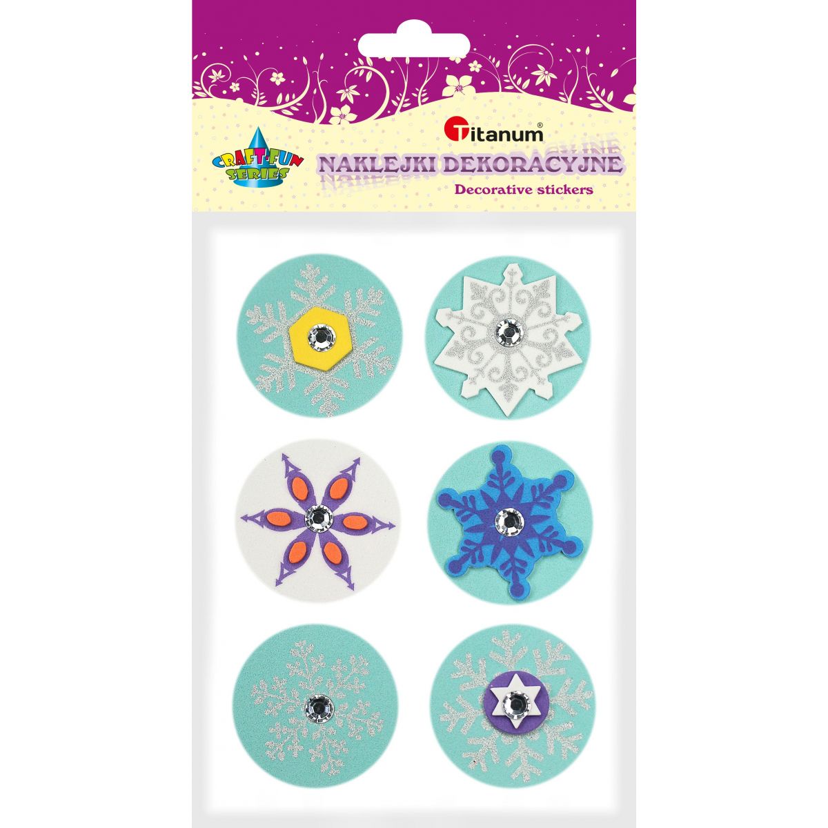 Naklejki piankowe 3D - śnieżynki na kole o średnicy 48 mm. Mix z brokatem i kryształkami. 6 szt.