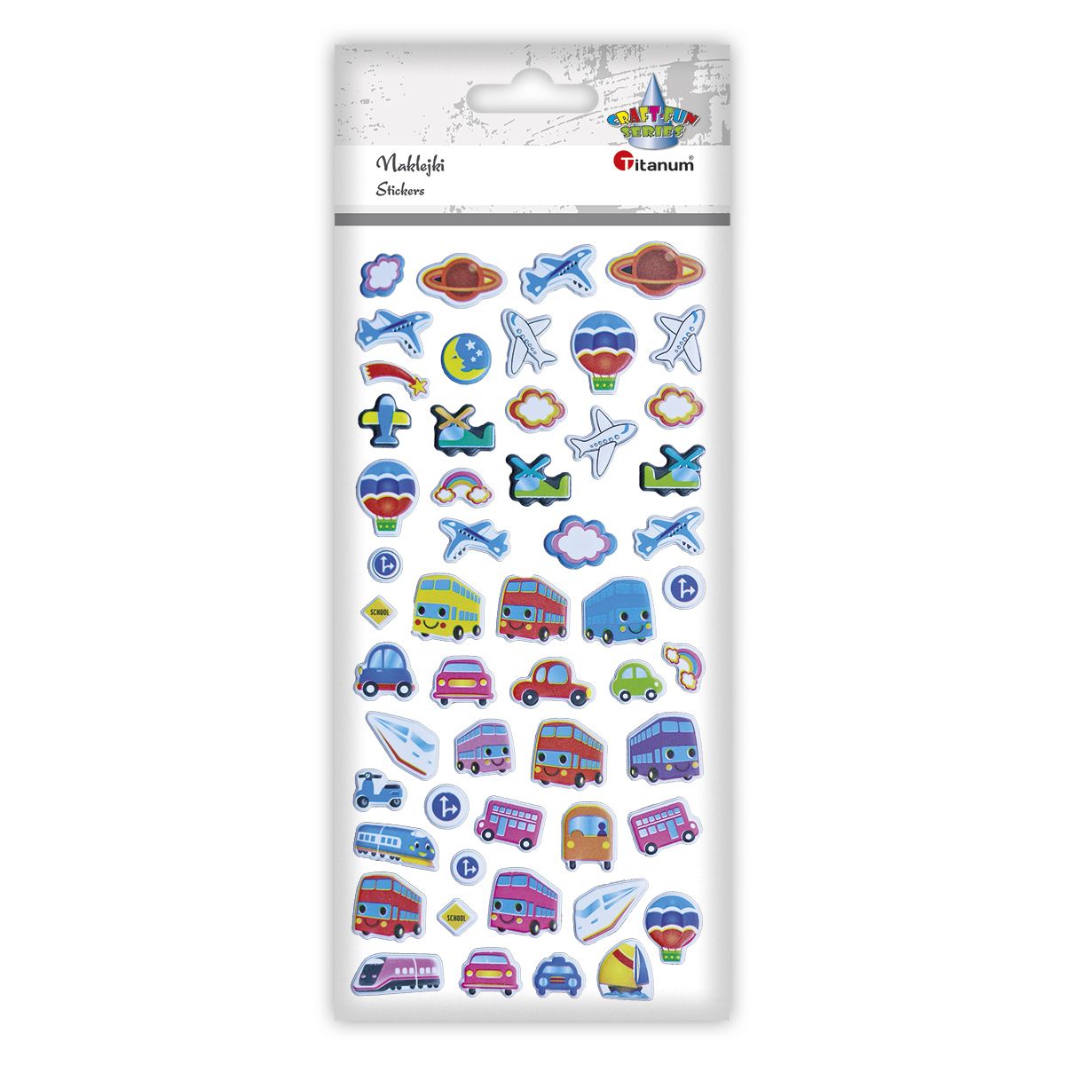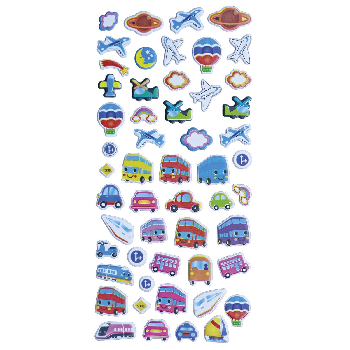 Naklejki wypukłe miękkie. Wzór: pojazdy jeżdżące, latające, planety. 53 sztuki.