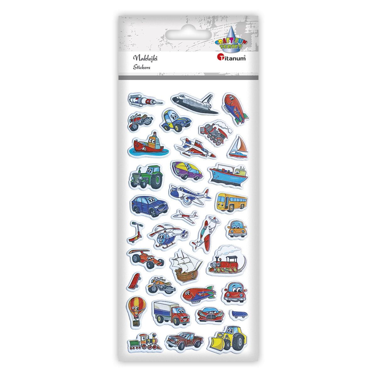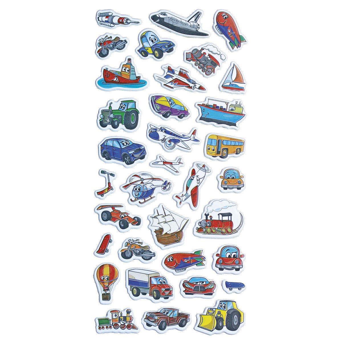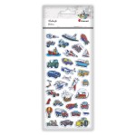 Naklejki wypukłe miękkie. Wzór: pojazdy jeżdżące, latające, pływające. 34 sztuki.