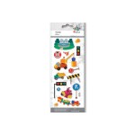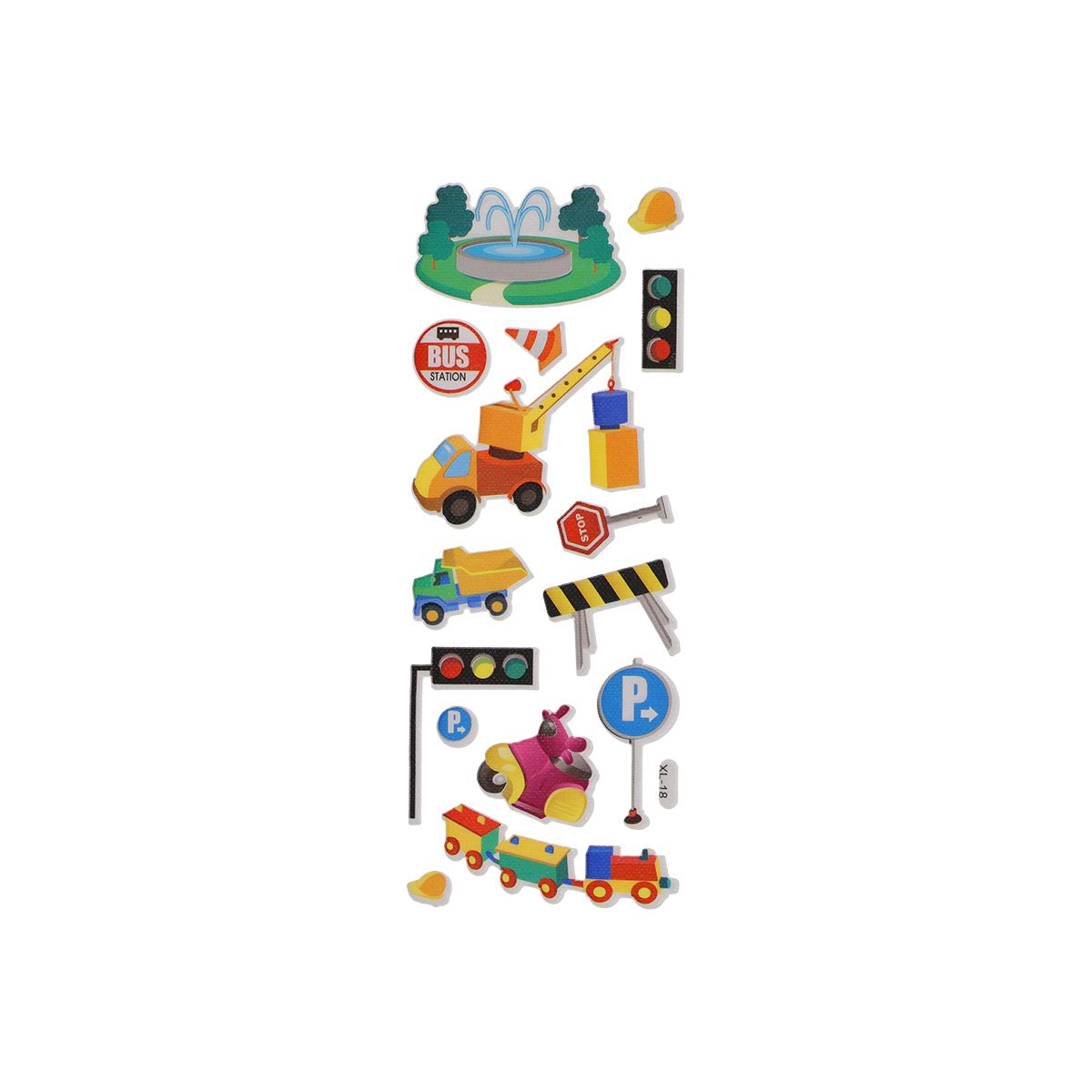 Naklejki wypukłe miękkie. Wzór: pojazdy budowlane, znaki drogowe, sygnalizatory świetlne, fontanna. 15 sztuk.