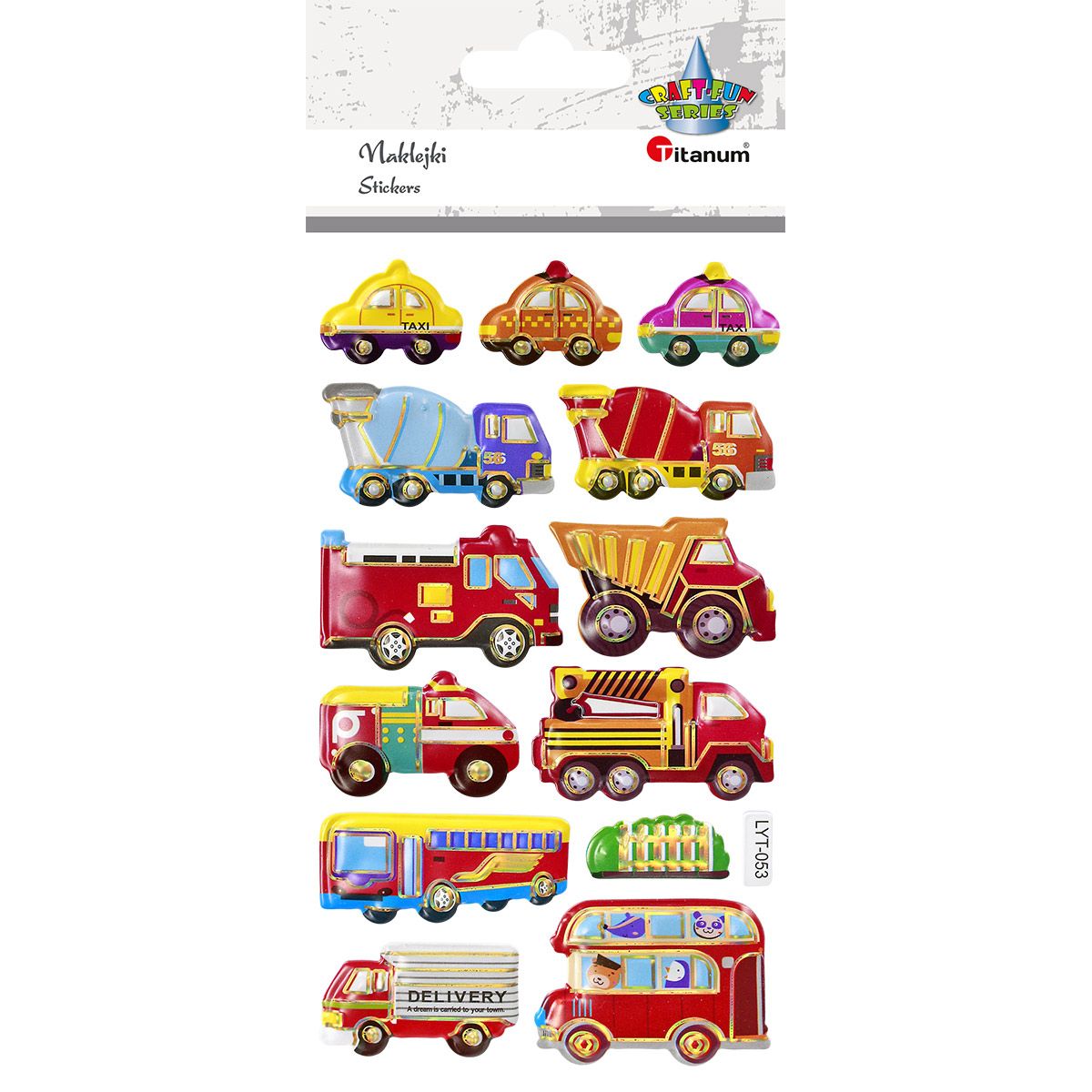 Naklejki wypukłe miękkie. Wzór: pojazdy miejskie. 14 sztuk.