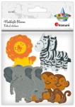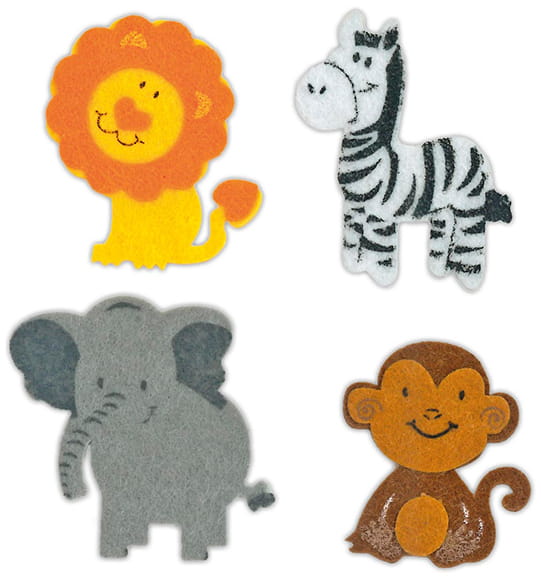 Naklejki filcowe, wzory: zwierzęta afrykańskie - lew 45x55mm, zebra 48x55mm, małpka 40x47mm, słoń 55x55mm. 12 sztuk.
