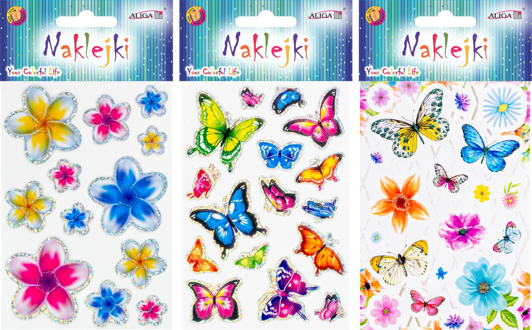 Naklejki kwiatki i motyle mix 3 arkusze 8x12cm, Aliga