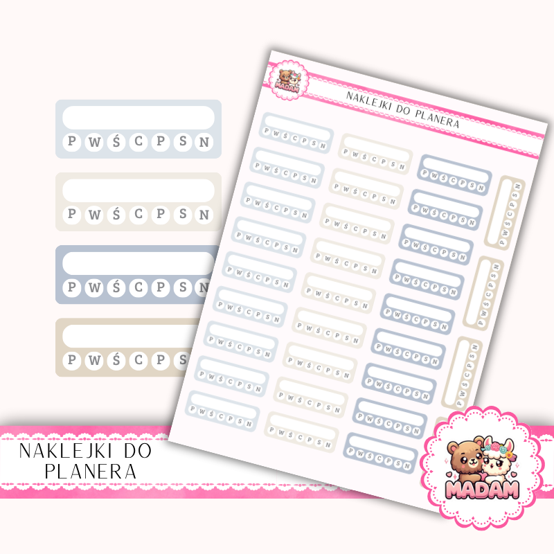 Naklejki planerowe habit trackery dni tygodnia MaDam Creative to narzędzie, które pomoże Ci śledzić codzienne nawyki w estetyczny i przejrzysty sposób. Idealne do planowania rutyn, tworzenia tabel postępów i monitorowania regularności działań.