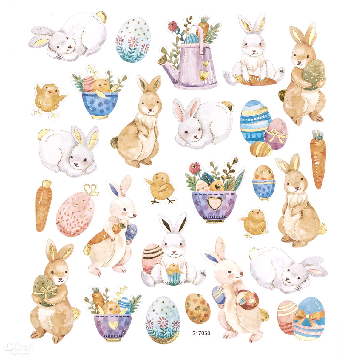 Śliczne, wielkanocne naklejki papierowe przedstawiające króliczki i pisanki. Wszystkie naklejki są częściowo pokryte metalicznymi, złotymi zdobieniami.