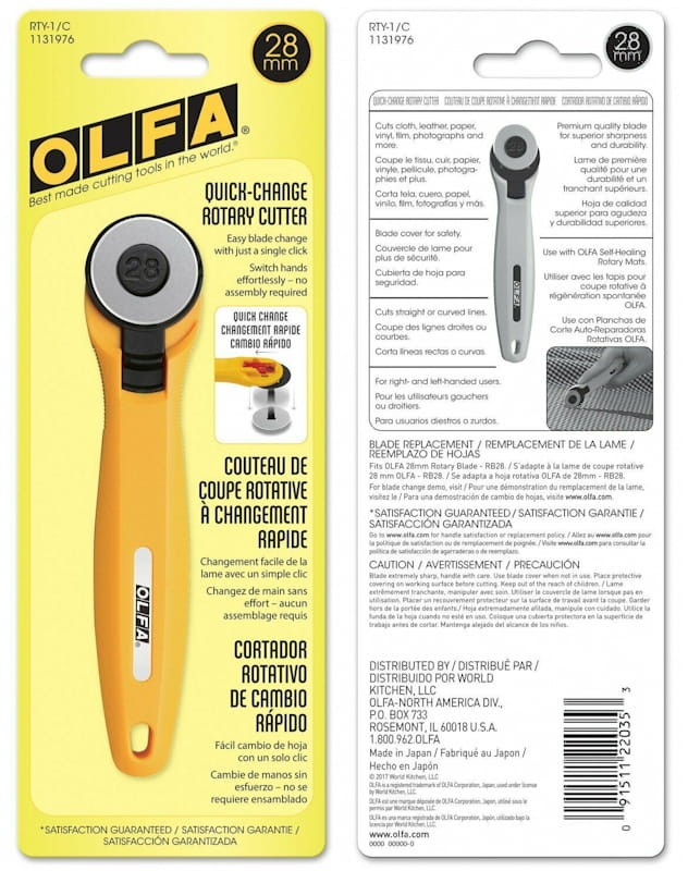 Nóż krążkowy z ostrzem o średnicy 28 mm do cięcia tkanin, skóry, folii, papieru - także kilku warstw jednocześnie.