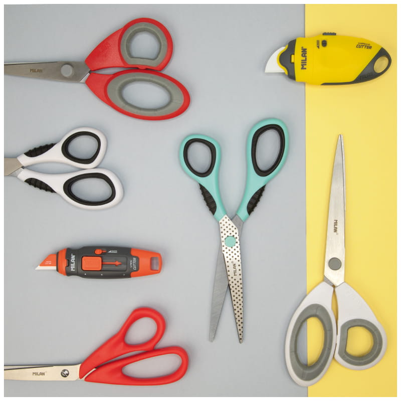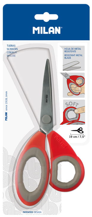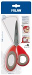 Nożyczki biurowe o długości 19 cm z ostrzem ze stali nierdzewnej. Czerwony plastikowy uchwyty z szarymi detalami w środku wyściełany gumą, odporny na wstrząsy. Oryginalny produkt stworzony przez własny dział badawczo-rozwojowy MILAN. Rozmiar nożyczek: 19 x 8,7 x 1,1 cm.