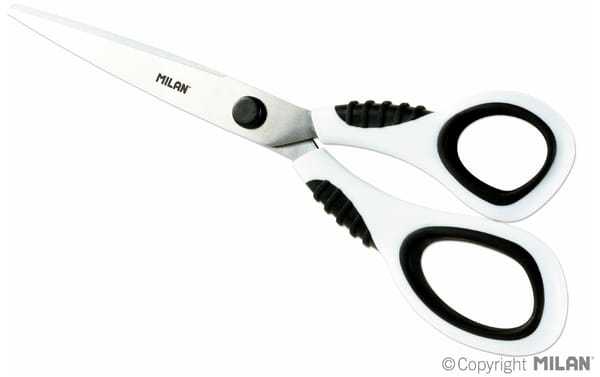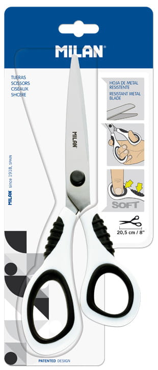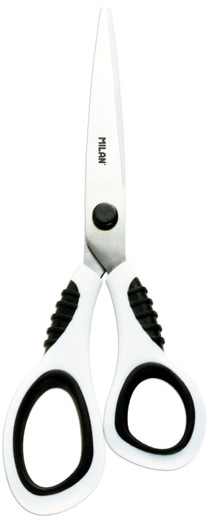 Nożyczki biurowe o długości 20,5 cm z ostrzem ze stali nierdzewnej. Biały plastikowy uchwyty z czarnymi detalami w środku wyściełany gumą, odporny na wstrząsy. Oryginalny produkt stworzony przez własny dział badawczo-rozwojowy MILAN. Rozmiar nożyczek: 20,5 x 7,2 x 1,3 cm.