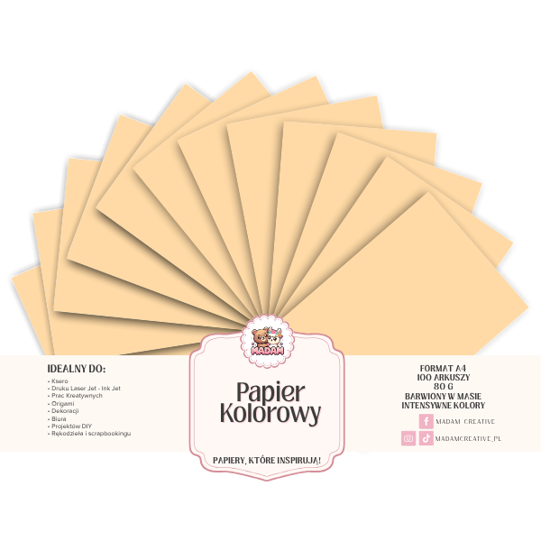 Papier kolorowy A4 Beż piaskowy MaDam Creative to połączenie wysokiej jakości wykonania z pięknym, nasyconym kolorem.